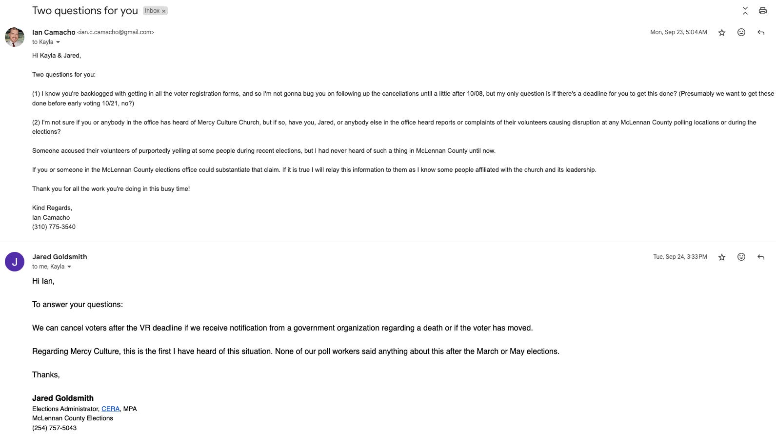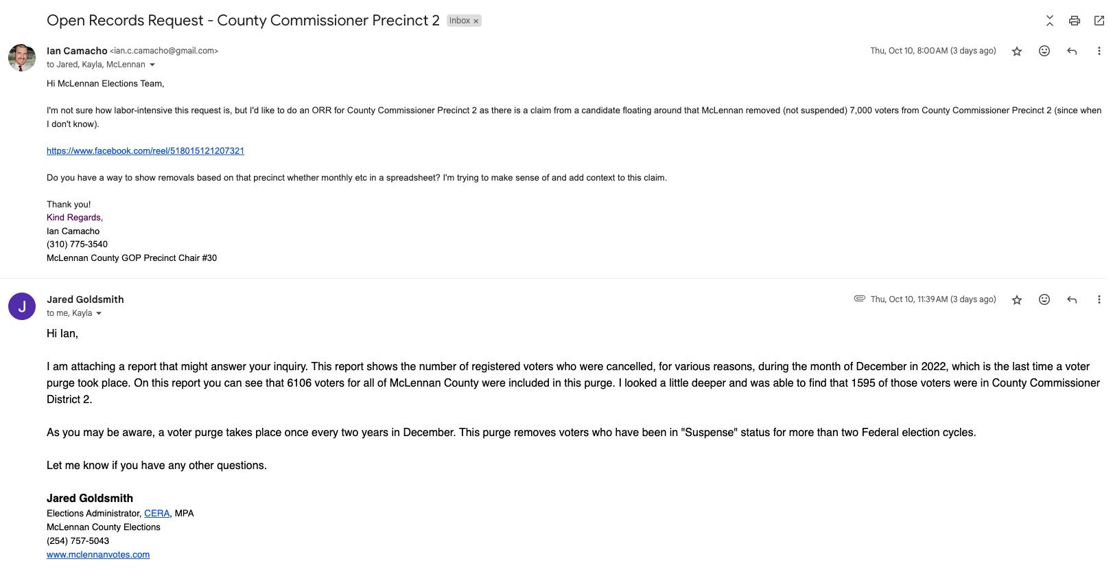 I recalled seeing something similar in McLennan from a political candidate. Democrat candidate for County Commissioner Precinct 2 Jeremy Davis (whom I’ve previously reported on for being dishonest) is fear-mongering that McLennan County purged 7,000 people from his precinct.