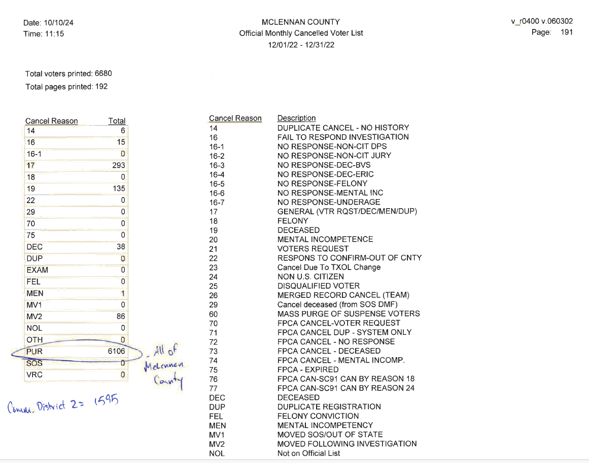 I’m still checking to see if there are anywhere close to 7,000 people removed from Precinct 2 in a “purge” or some other version of this after 2022 – even though it’s only done every December after a general election – but so far nothing supports that.